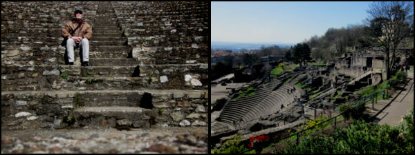 Day 7: Roman antiquity; Easter churches; Another Bouchon; museums: The sun shone today but did not erase the chill. It is Easter and my path took me into several Catholic services. Into "Old Lyon" I took the funicular up to the Roman amphitheater and its stunning museum. It has the most impressive mosaics I have ever seen. Then to another bouchon, but only three courses today! Then the museum of movie artifacts (!) and miniatures and a "Guignol" museum--Lyon's famous puppet. Now an evening to read (Girl With a Pearl Earring) and rest.